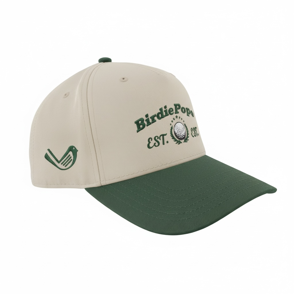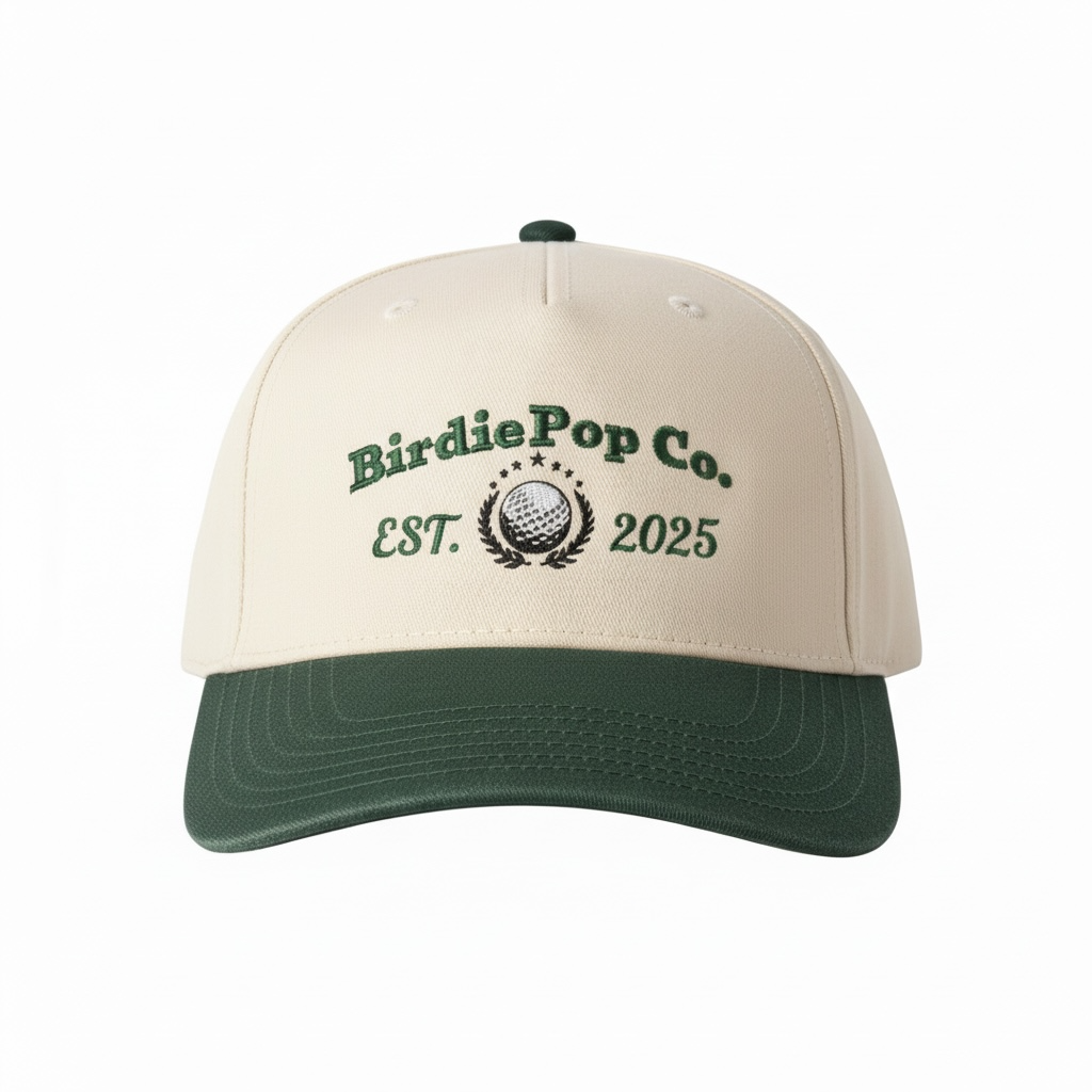 Natural with Dark Green Bill 069 Otto Cap 5-Panel Mid Profile hat. BirdiePop Golf Ball logo.